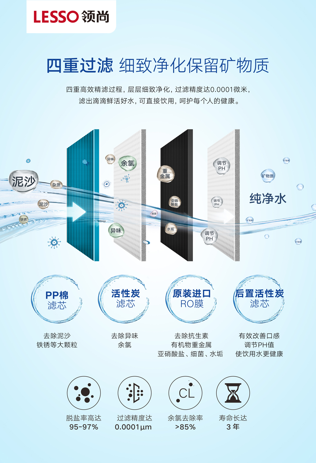 為了達(dá)到更精細(xì)的過濾效果,領(lǐng)尚反滲透凈水機(jī)LS314GR采用四層高效精細(xì)過濾系統(tǒng),包括:“PP棉濾芯+活性炭濾芯+原裝進(jìn)口RO膜+后置礦化富鍶濾芯”,無論是水中的雜質(zhì)、漂浮物,還是肉眼不可見的重金屬、農(nóng)藥殘留物、化學(xué)污染物都能有效攔截,過濾出來的水可達(dá)到直接飲用的標(biāo)準(zhǔn)。