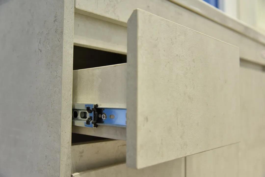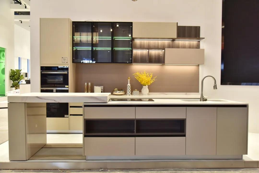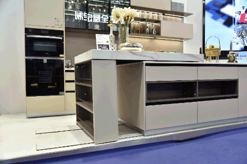 在廣州建博會,領尚帶來了功能升級的廚房好物——領尚櫥柜-圣莫尼卡,配備可伸縮電動島臺,電動、手動均可完成臺面空間的自由擴充,島臺既可作餐桌也可作備餐區,有效提高廚房空間的利用率,并為社交互動創造條件。