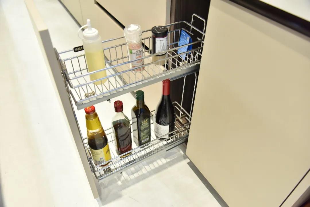同時領尚關注用戶多種收納需求,設置多種柜體,豐富儲存面積的同時,采用簡約通透的玻璃柜門,更顯別致格調;搭配嵌入式電器柜設計與多功能拉籃,實現收納功能進一步升級;櫥柜選用黑胡桃與燕麥奶昔作搭配,輔以簡約奢華的白色大花紋石英石襯托,營造廚房空間的整體美感。