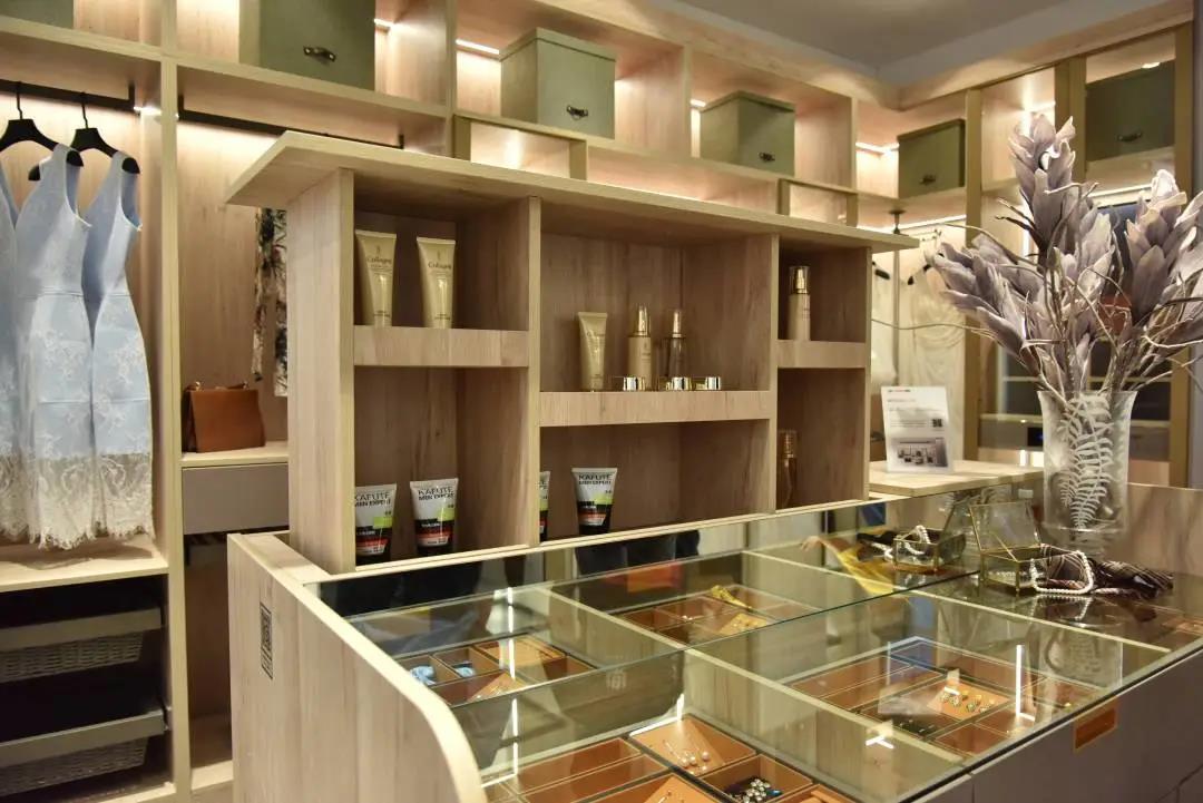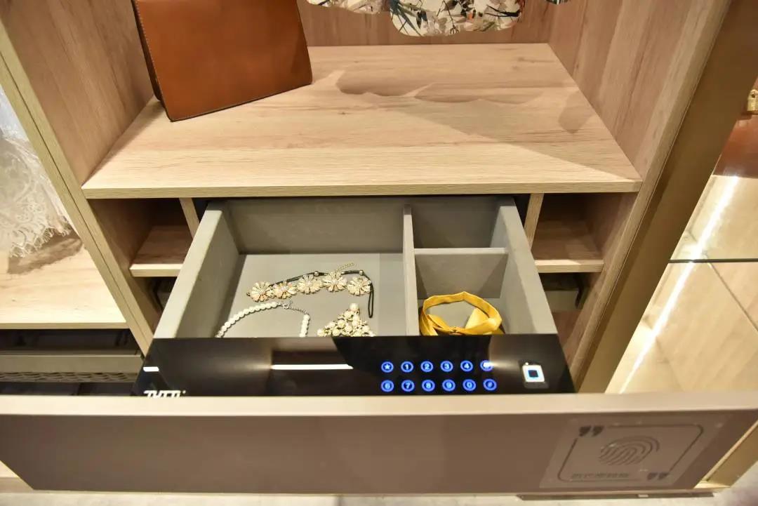 不同于普通衣柜,領尚城市記憶衣柜特別設計島臺升降機,把收納空間暗藏,下嵌臺面規整收納散亂的首飾;更安裝消毒除濕器,讓衣物井井有條的同時也能干凈整潔。觸摸控制的智能LED鏡,不僅令女主人的美麗更顯精致,并打造出空間敞亮質感。