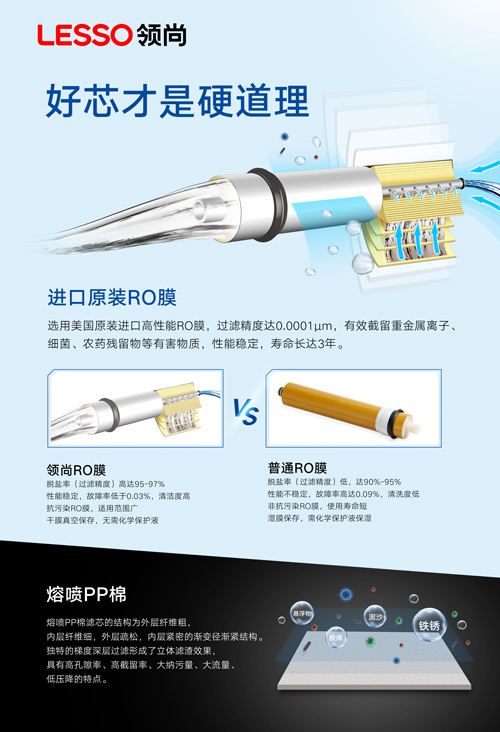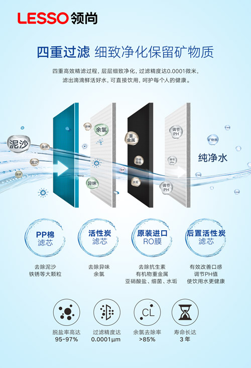 四重高效精濾過程,層層細(xì)致凈化:美國進(jìn)口RO膜,四重優(yōu)質(zhì)濾芯除雜,過濾精度達(dá)0.0001微米