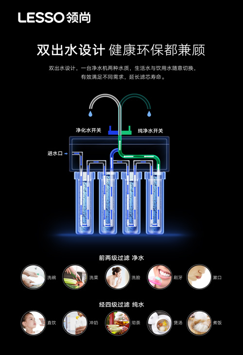 雙出水設(shè)計,健康環(huán)保都兼?zhèn)洌阂慌_凈水機(jī)兩種水質(zhì),生活水和飲用水隨意切換,有效滿足不同需求