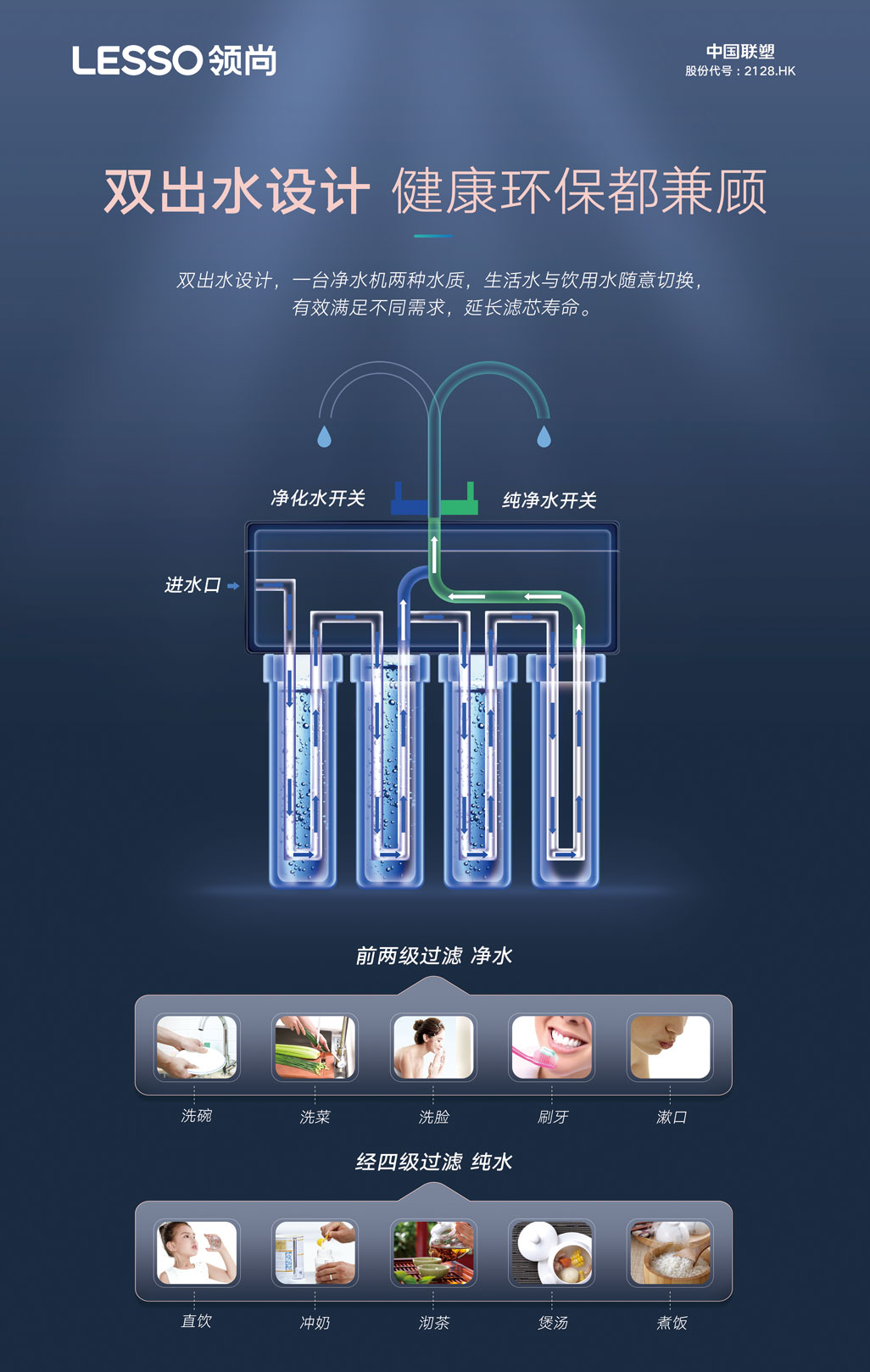 ①雙出水設計,兼顧生活水與飲用水,延長濾芯壽命