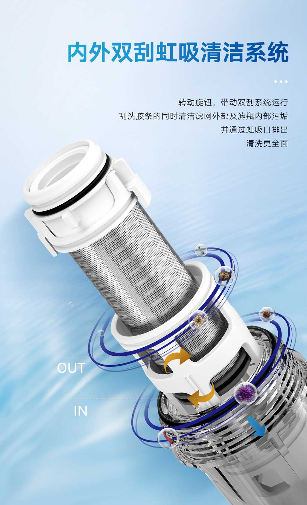 ③虹吸雙面旋刮技術(shù),高效清洗濾芯