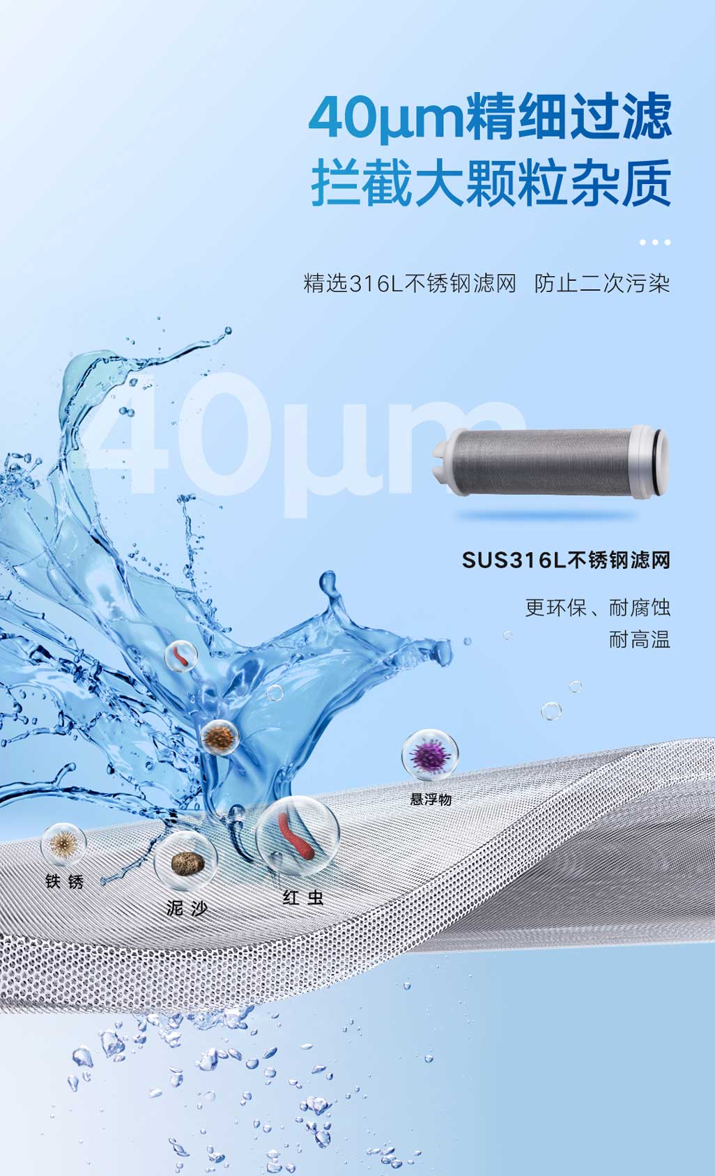 ①40微米高效精濾,食品級不銹鋼濾網(wǎng),有效阻擋紅蟲、泥沙等雜質(zhì)