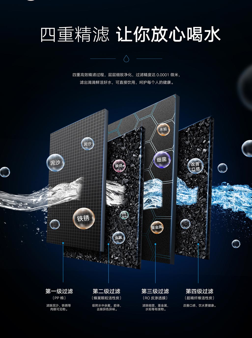 過(guò)濾工藝:PP棉濾芯+活性炭濾芯+50GRO反滲透膜濾芯+后置活性炭濾芯