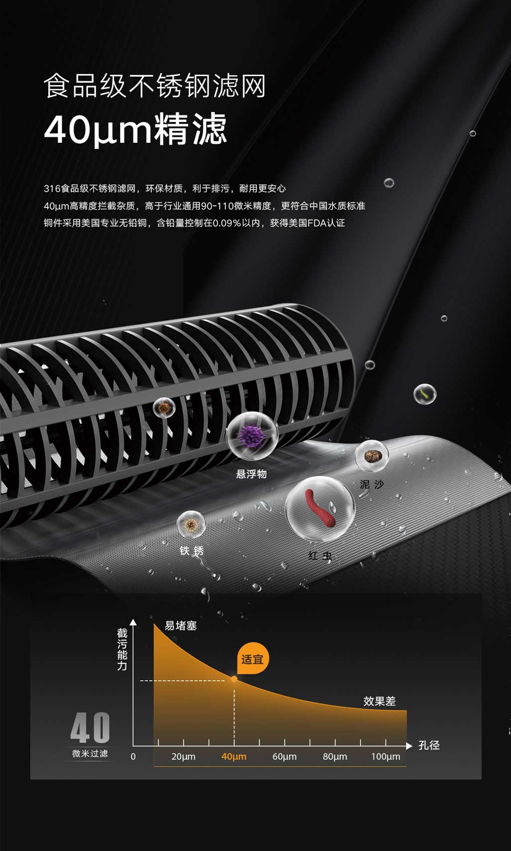 ①40微米高效精濾,食品級不銹鋼濾網,有效阻擋紅蟲、泥沙等雜質